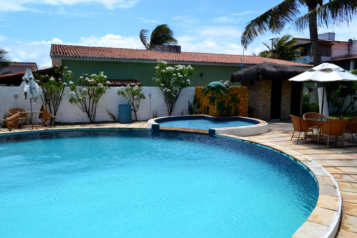 Поверьте на слово - это просто ОГРОМНЫЙ (по бразильским меркам) бассейн. Удобным является то, что он разделен как бы на три сегмента, что позволяет людям плавать, не мешаясь друг другу. Вода чистая, благодаря теплой погоде очень комфортная по температуре, никакого запаха хлорки не чувствовали. Глубина постоянная - около 1,6 м и чуть меньше в зоне джакузи, где каждый желающий может нажатием кнопки включить "бурление", которое через 10 минут автоматически отключается.