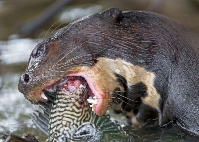 Длина тела бразильских выдр достигает двух метров (70 см из которых приходятся на мощный хвост). Они живут сплоченными группами и занимают постоянную территорию, которую охраняют от чужаков с особой бдительностью и воинственностью. Питаются эти выдры в основном рыбой, но не брезгуют змеями, заплывшими в их водоем, иногда лакомятся птичьими яйцами и птицами. По уровню бесстрашия бразильских выдр можно сравнить разве что с медоедами (сородичами по семейству куньих) — их не пугают ни зубастые кайманы, ни голодные ягуары.
