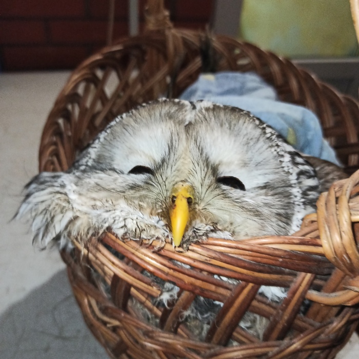 Посадил её в корзинку с грибами и донёс до дачи, чуть напоили и дали куриного мяса. Первая мысль была позвонить пикабушнице @Yoll, тк она занимается совами. Но оперативно прямых контактов найти не удалось.