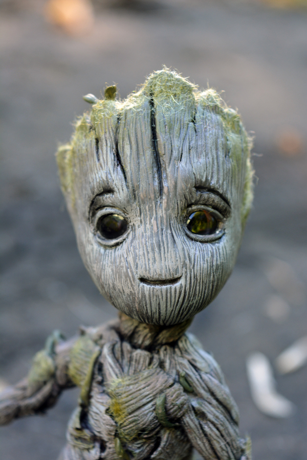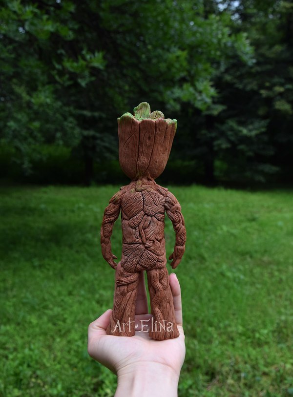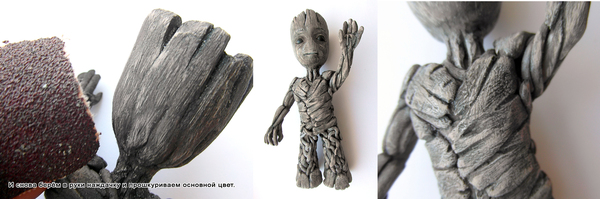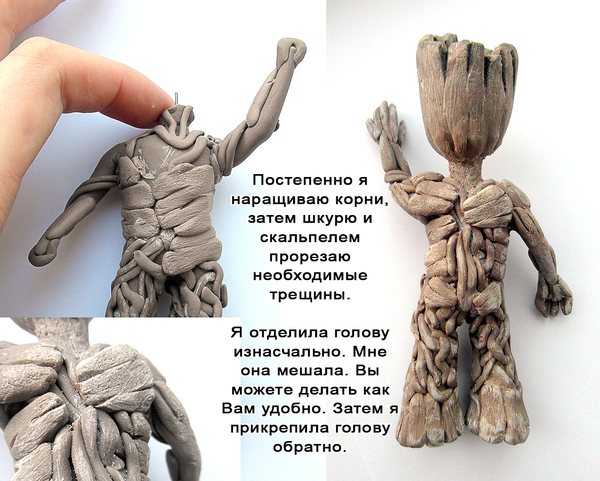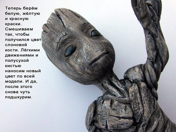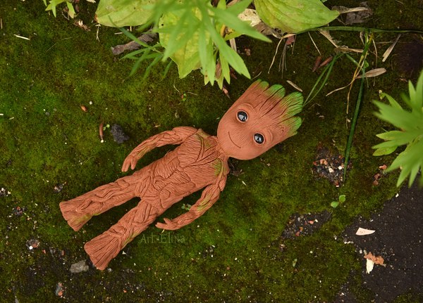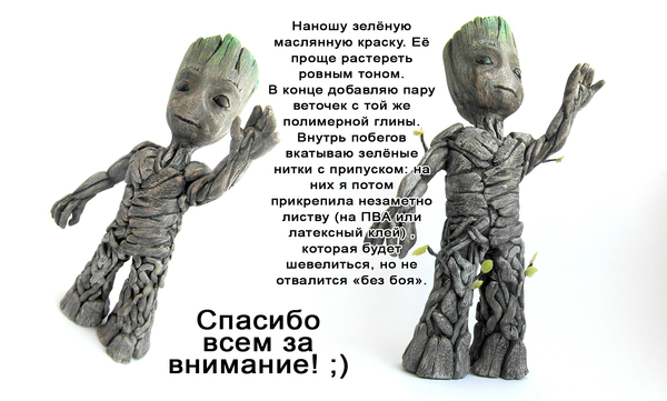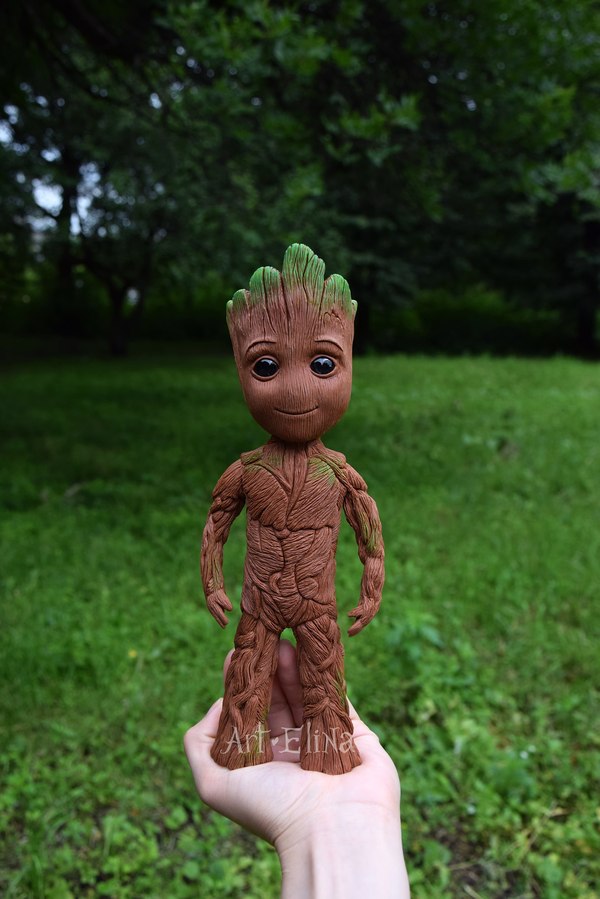 Внутри каркас из проволоки, малыш неподвижый, сделан из полимерной глины