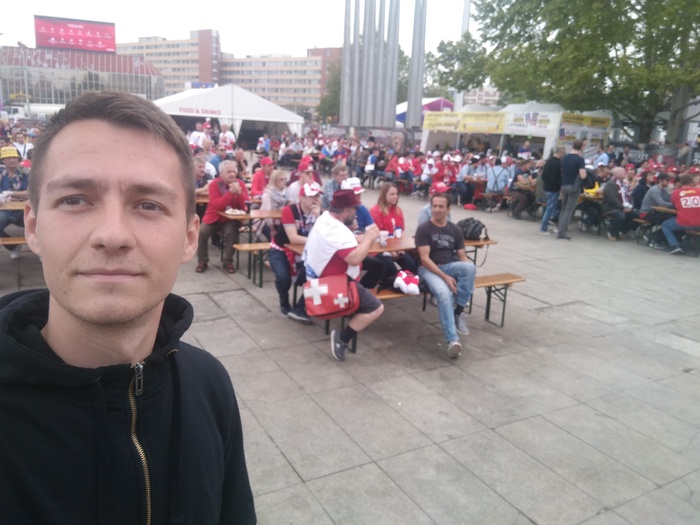 Вокруг была куча Швейцарцев, я взял себе пива и присел за лавочку к компании ребят. Они в этом матче решили болеть за Россию, так что я удачно нашел компанию на просмотр матча. Мы сидели, общались, смотрели игру и пили пиво.