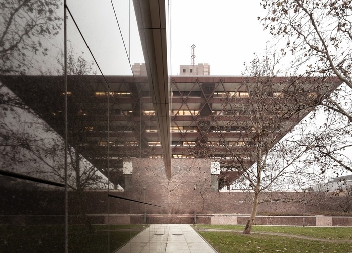 Ядро здания образовано стальным пилоном, вокруг которого сооружена стальная конструкция в виде перевернутой пирамиды.