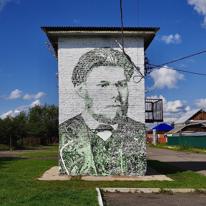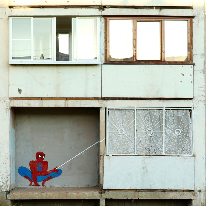 Это работа уличного художника Григория Шарова, копия работы французского художника Балала Беррени в рамках фестиваля «Один за всех», который каждый год Шаров проводит в одиночку.
