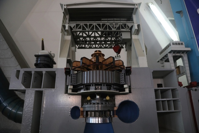 Сразу при входе в машинный зал установлен вот такой наглядный макет, который показывает, как устроен и расположен гидроагрегат в плотине. Вода сверху по желобу срывается вниз, набирает скорость и попадает в камеры с лопастями турбины генератора, который в свою очередь преобразует энергию воды в электроэнергию.