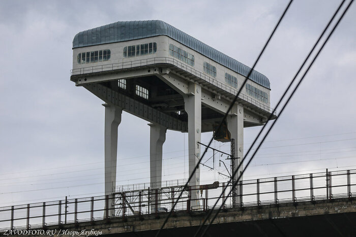 Для маневрирования затворами на гребне плотины смонтированы два вот таких козловых крана грузоподъёмностью по 150 тонн.