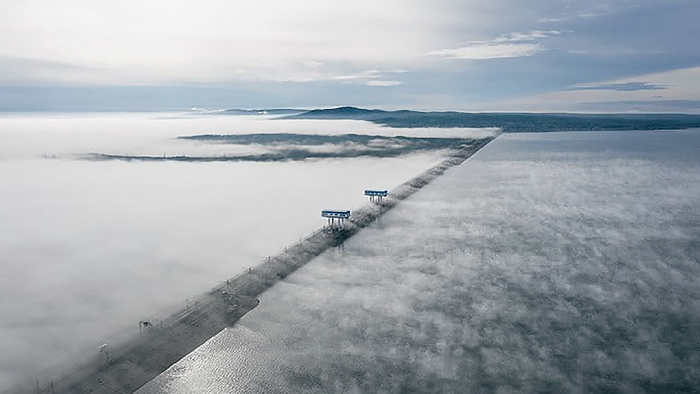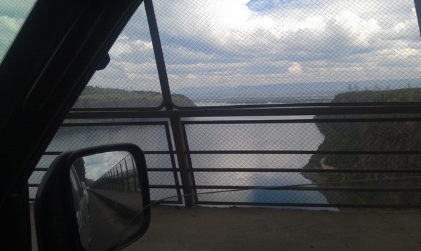 После этого мы поехали посмотреть на противоположную сторону плотины. Дорога проходила по импровизированной "полке-мосту", расположенном на боку плотины. Если со стороны Братского моря плотина практически сливается по высоте с береговой линией, то с противоположной стороны она выглядит как весьма высокое и монументальное сооружение. После небольшой фотосессии мы двинулись на выезд из города, так как планировали к полуночи добраться до Иркутска.