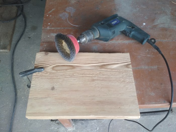 Обрабатываем дерево дрелью со щеткой для металла.