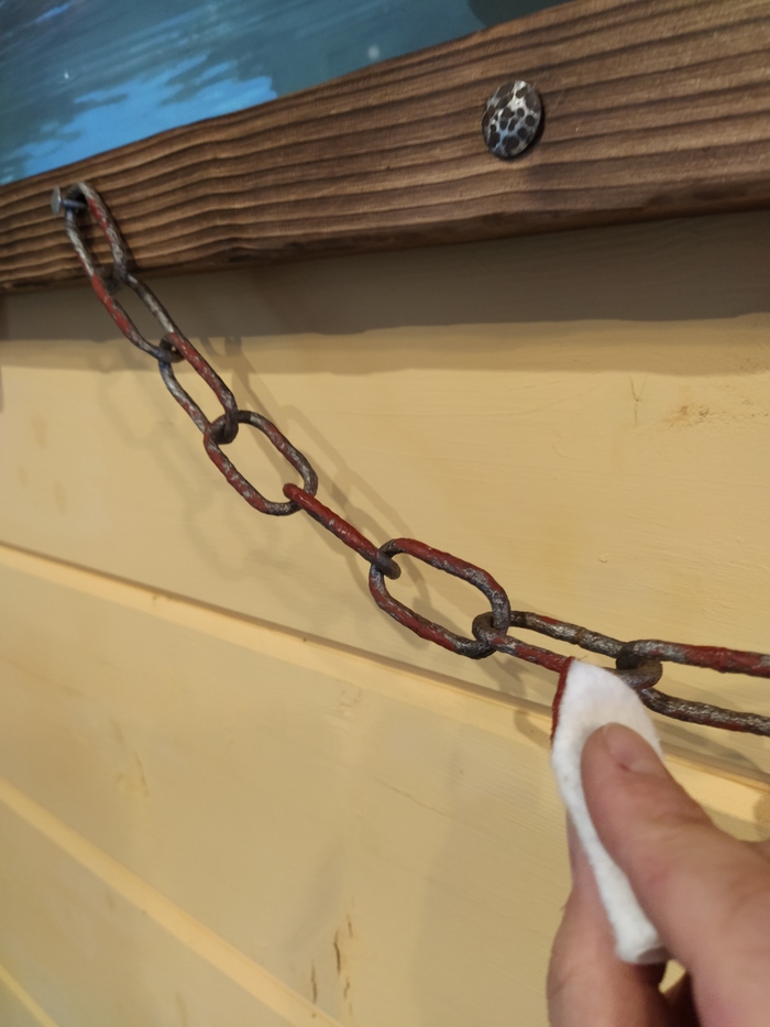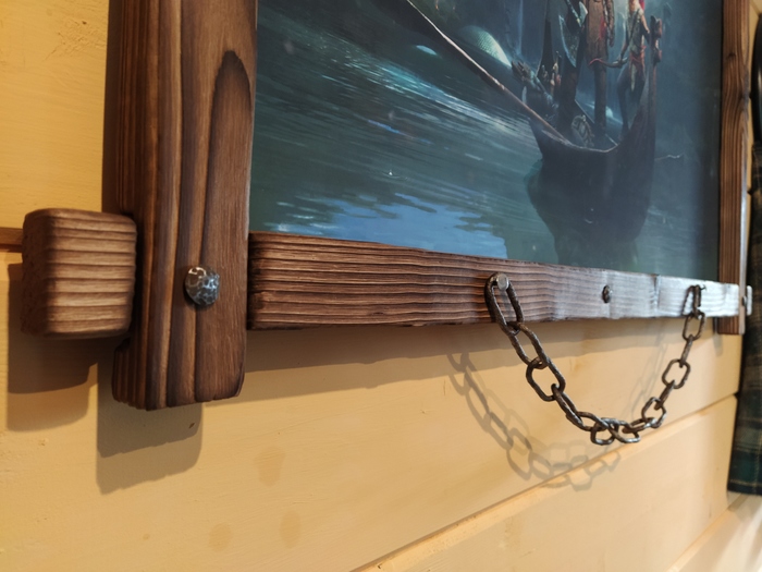 Прикрепляю холст. Добавляю немного фурнитуры, сделанной в ручную и обрезок старой, ржавой цепи, очищенной кислотой. Давно валялась, а тут прям пригодилась.