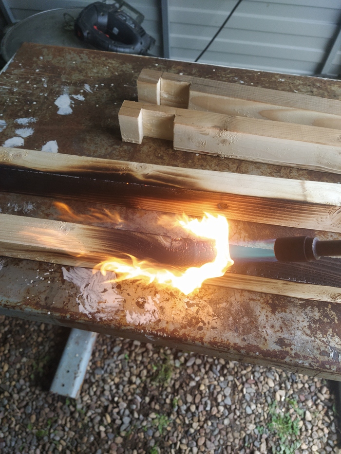 Закупив все необходимые расходники, начал я свои попытки в обжиге сосны. Отрезал кусочек от основной доски, и начал его обжигать, дабы понять, какого оттенка дерева я хочу добиться.
