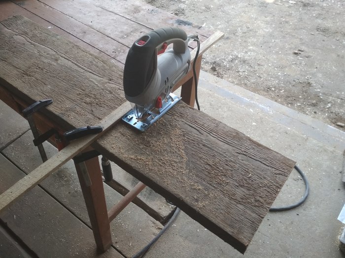Лобзиком отпиливаем нужный кусок старой доски. Чтоб сделать ровный разрез надо прикрутить струбцындами к доске направляющую рейку. Ну тут все понятно.