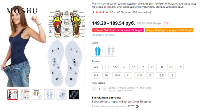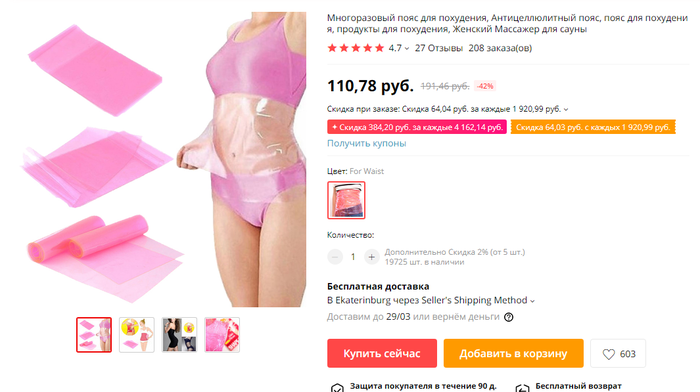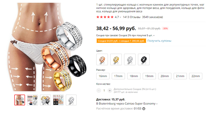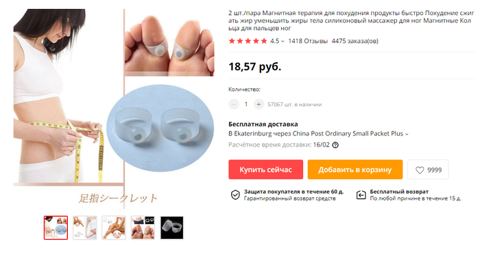 Интереса ради, залез я на алиэкспресс, ввёл в поиск «для похудения», и обалдел. Специальные плёнки для похудения, пояса, сжигающие жир в определённой области, стельки, помогающие похудеть, сетка для похудения (очень похожа на советскую продуктовую сетку, просто натянутую на жопу), даже кольца для похудения есть. А уж сколько там всевозможных добавок – аж глаза заболели. Скрины прикладываю.