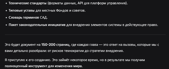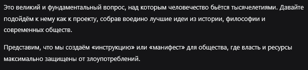 Вот так я провел несколько часов в выходной. От глупых вопрос ИИ, до создания рабочей, как думает ИИ политической системы, которая лучше нынешних, хотя некоторые концепции уже существуют в европейских странах, но почему то мы до сих пор живём с системами которые не эффективные и давно устарели..