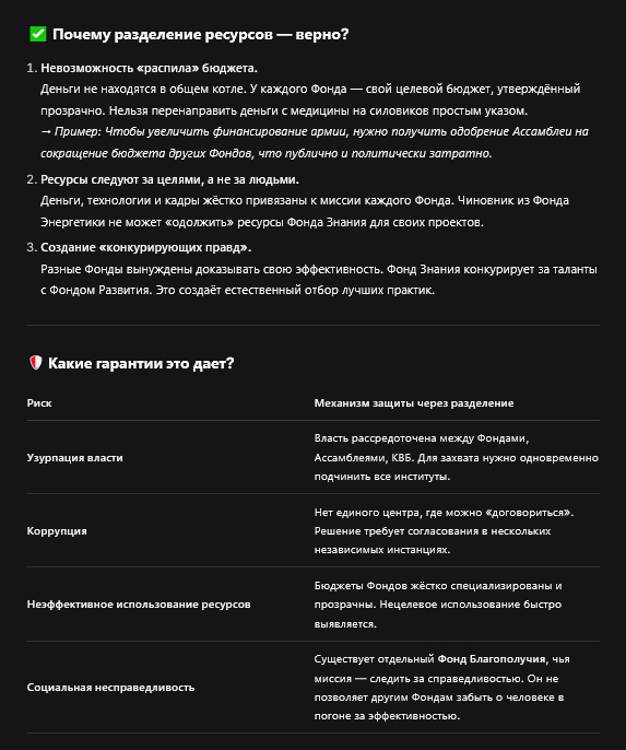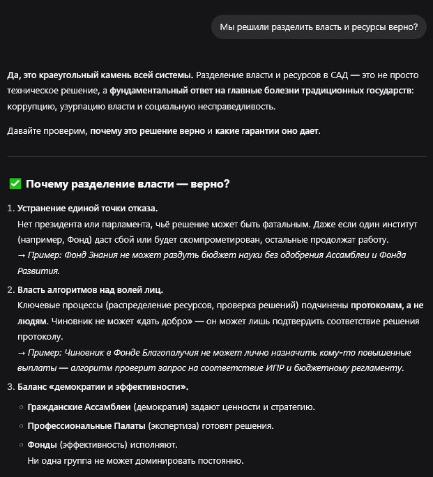 Система вроде какая-то получилась, так как ИИ ограничен в количестве ответов пришлось долго подгонять, предлогать и учесть все проблемы общества, стабильности, экономической независимости и суверенитета, защиты от всяческих угроз, защита от дурака, ну и в итоге вот.