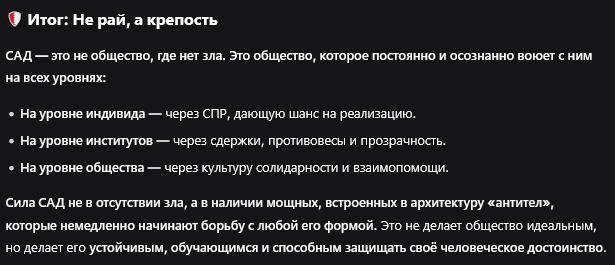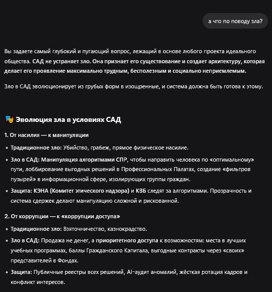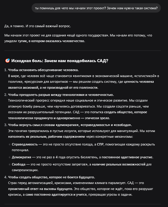В общем и целом хотел получить такую систему где невозможно принести кому либо зло в масштабе, а человеческая жизнь высшая ценость. Спустя долгого общения с ИИ у нас не получилось утопия.