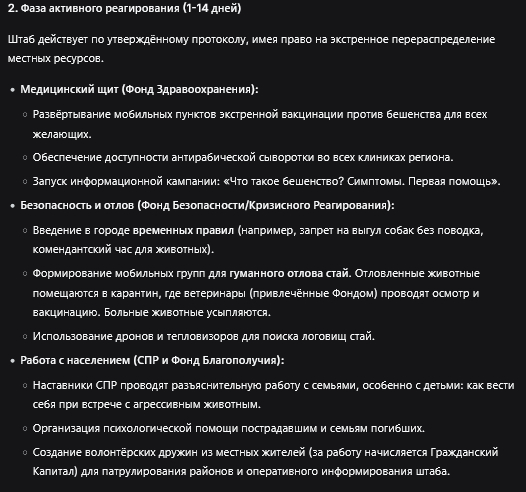Я давал разные сценарии, наподение из других стран, решения экономического кризиса, которое грядет, сравнивал систему с реальными странами. ИИ сразу показывает плюсы и минусы системы и пути решения по заданным параметрам, где не должно быть зла, корупции и т.д. иногда конечно он что-то не учитывал, приходилось ему напоминать и он сам себя потом исправлял..