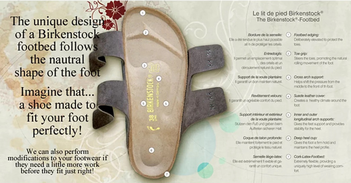 В основе каждой сандалии Birkenstock лежала фирменная стелька бренда. Разработанная в тридцатые годы, стандартизированная стелька Birkenstock имеет глубокую контурную форму с приподнятым носком для сцепления со ступней и ее устойчивости. Обычно установленная на подошве из этиленвинилацетата (EVA), стелька изготовливалась из пробкового латекса с пенопластовым покрытием и замшевой подкладкой. Помимо того, что она удобна и регулирует осанку с самого начала, натуральные материалы, используемые для изготовления стельки Birkenstock, со временем смягчаются и принимают форму стопы владельца, улучшая комфорт и сцепление с течением времени.