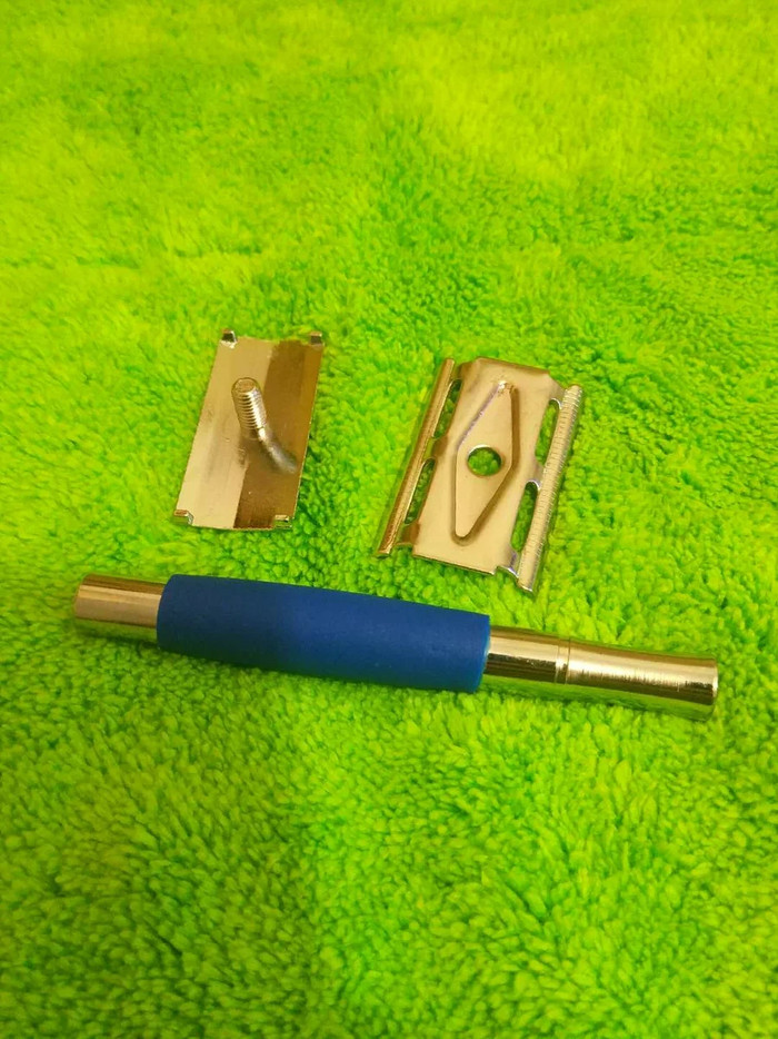 Бритва увесистая, 63 грамма, ручка изготовлена из латуни и хромированная, плита штампованная, верхняя крышка вроде как из замака и тоже хромированная. Хромированное покрытие плохое и как будто его нанесли прямо на пыльные детали, в ручке отверстие просверлено криво, но накручивается без проблем, на саму ручку натянута простая резинка, чтобы не скользила во время бритья. Голова очень легкая, так что баланс идет весь в ручку. Ну в принципе чего еще ждать за эти деньги ))