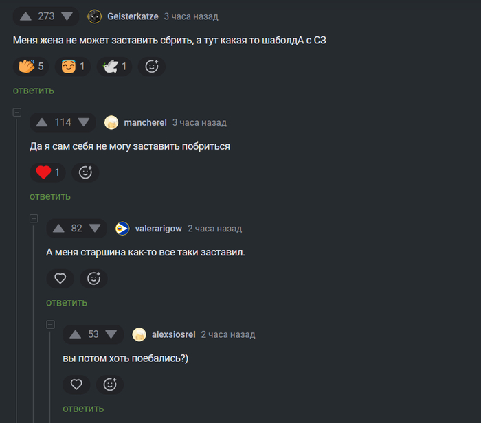 12 H.Sapiens Улыбнись! Пока в армии... 2 года назад #comment_181429940 Скриншот Комментарии на Пикабу Армия Бритье Мат Ещё 0