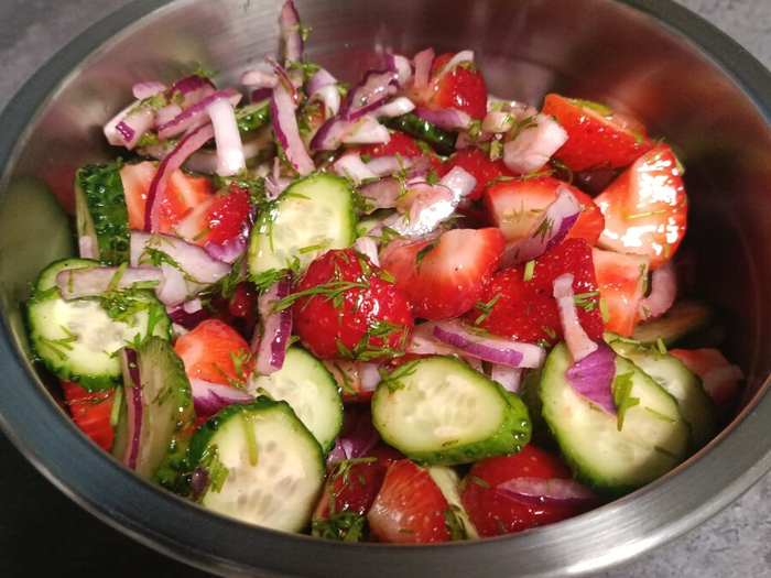 В миске смешать клубнику, огурцы, красный лук и укроп. В отдельной миске смешать мед и лимонный сок и вылить на сальсу, аккуратно перемешать, приправить солью и свежемолотым черным перцем. Можно убрать в холодильник на несколько часов. Достать за 30 минут до жарки.