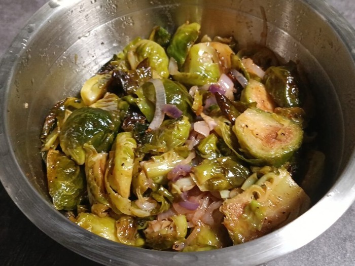 Срезать у брюссельской капусты жесткие части и разрезать пополам (через стебель). Затем выложить на противень вместе с луком и чесноком. Полить оливковым маслом, солью и черным перцем, перемешать и перевернуть брюссельскую капусту срезом вниз. Запекать 15-20 минут.