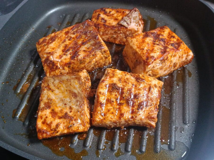 900 гр. нарезанного очень крупными кусками филе лосося без кожи
