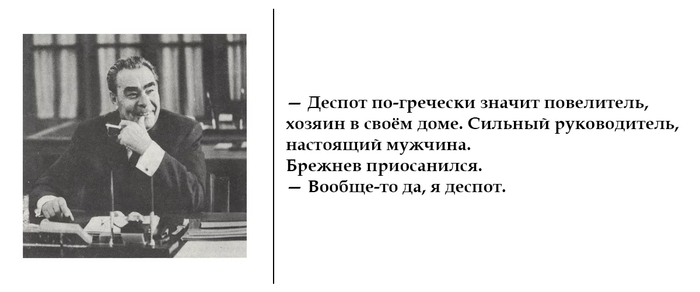 Как-то в Париже на приёме к Брежневу подошёл Робер Эрсан — газетный магнат правой ориентации, в изданиях которого появлялись пасквили на Брежнева. “Кто это?” — спросил Брежнев у посла. — “Это наш враг. В его газетах вас деспотом называют!” Брежнев нахмурился: “Это правда? А почему вы меня так называете?” Эрсан принялся разъяснять: “Деспот по-гречески значит повелитель, хозяин в своём доме. Сильный руководитель, настоящий мужчина”. Брежнев приосанился: “Вообще-то да, я деспот”. И приобнял Эрсана.
