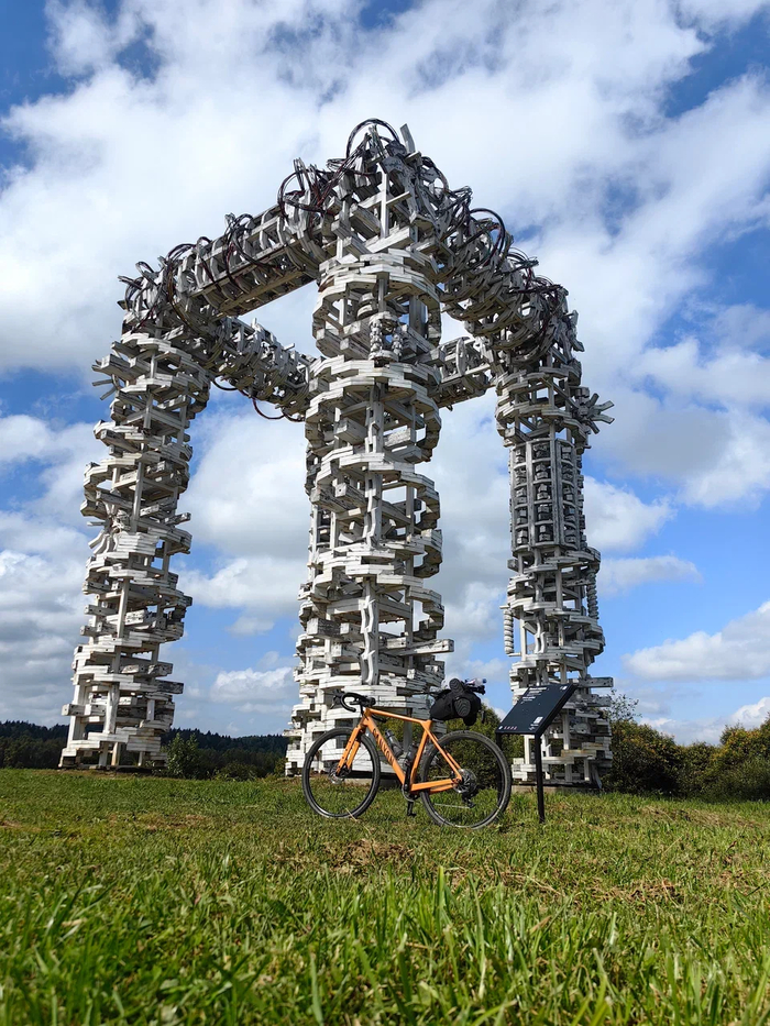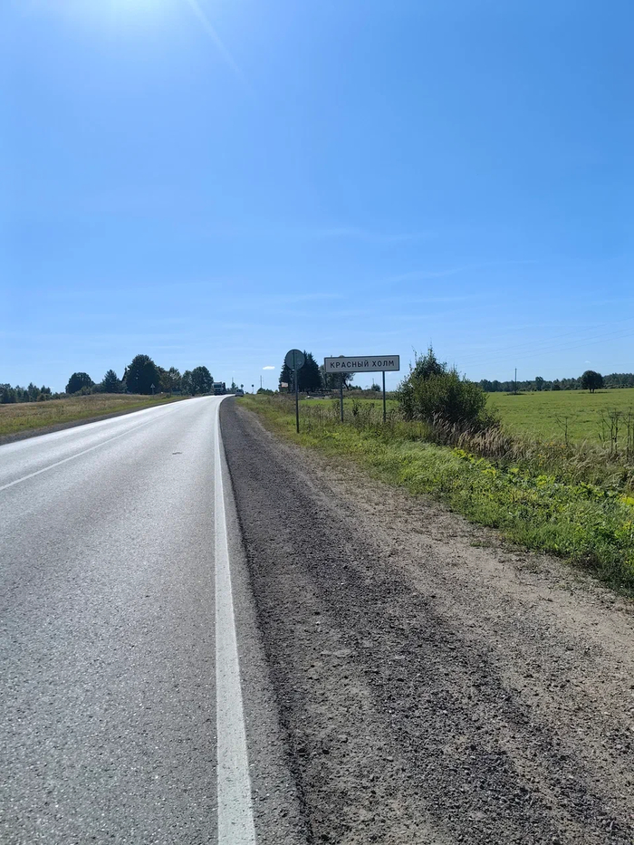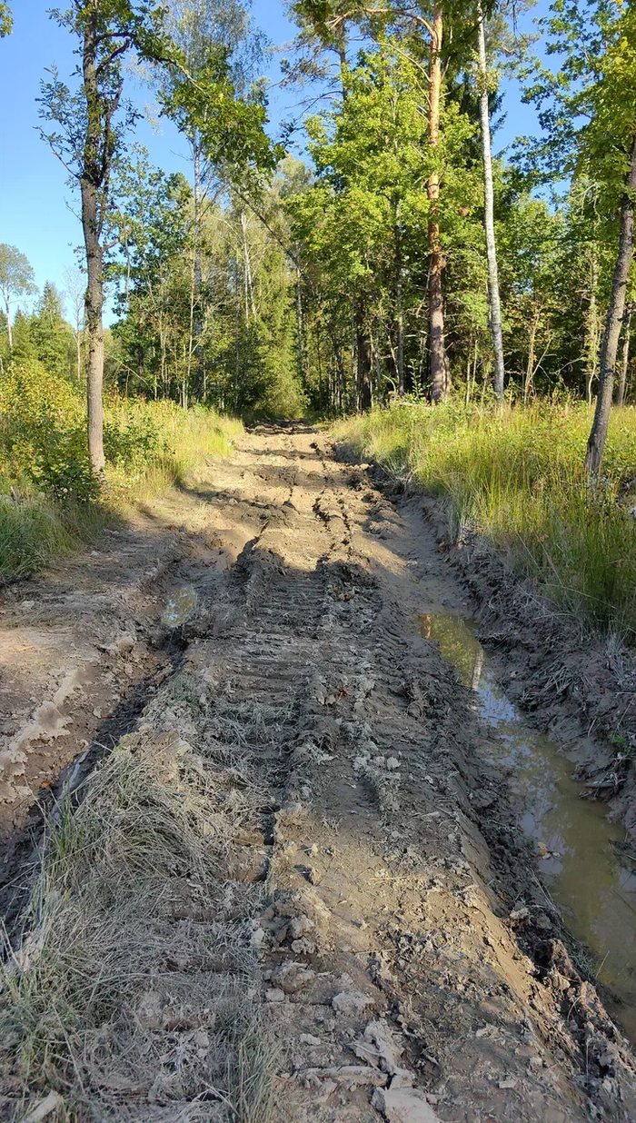 На тридцатом километре решил срезать путь по грунтовке. Сначала всё выглядело хорошо, но вскоре дорога стала теряться в густой траве и позже упёрлась в завал из молодых берёз. Шёл пешком, отмахиваясь от настырных лосиных мух, а на обратном пути снял с себя клеща. Вернулся к маршруту и почувствовал, как приятно снова крутить педали.