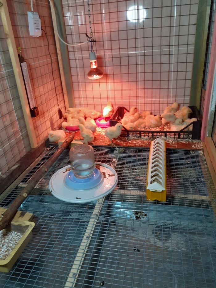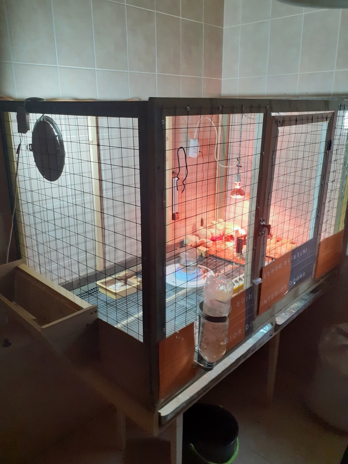 Про брудер: сделан из реек, сетки (50х50 стенки, и 10х20 пол) и шурупов-клопов. Четыре стенки, одна с дверцей; пол, и 2 поддона согнул из листовой жести. Сделал все играючи, за несколько часов. Из инструмента- шуруповерт, болгарка и ножевка. Ставится как конструктор, разобрать легко. Скрутил шурупами на месте установки. Стоит в цоколе дома, вони нет, иногда включаю вентилятор вытяжки, когда влажность очень большая становится.