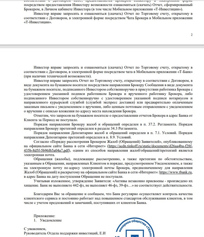 Сейчас на претензии не отвечают, доказательная база с заявками заблокирована. Постановление МВД о продаже Т-банком акций без согласия клиента по заниженной в 2.7 раза цене по фиктивной оферте 9 мес. не выполняют - ущерб не платят.