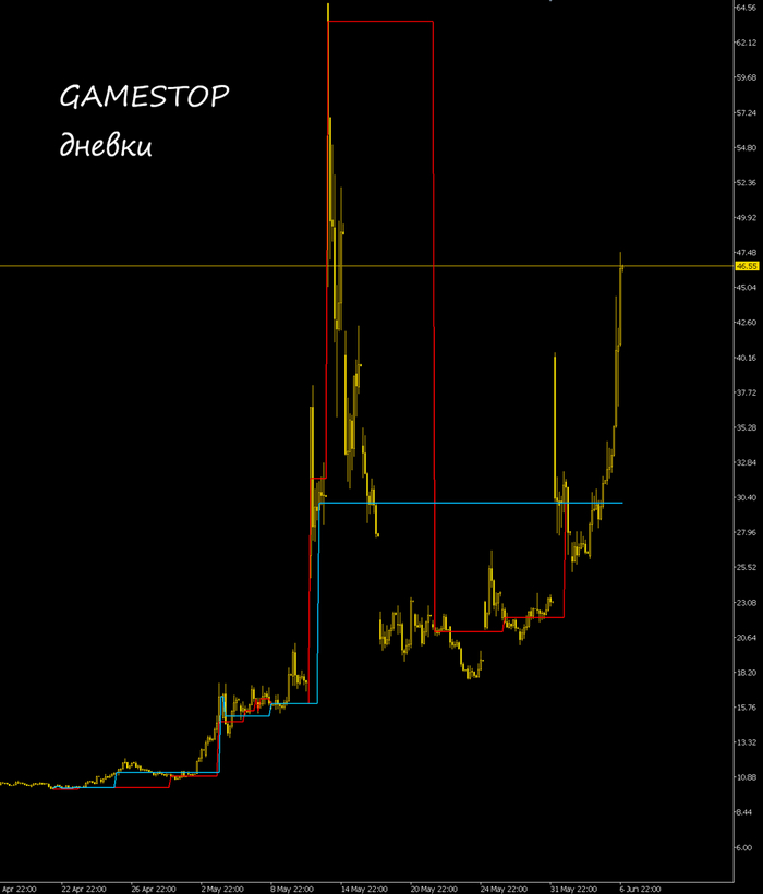 Я писал (https://t.me/marketscreen/12966) уже, что GameStop могут разогнать еще раз. Ну и оно случилось. С отката в конце мая бумага уже выросла на 150%. Заметьте, что движение снова идет от тех уровней, где проторговывается максимальный объем. Про это писал в прошлом посте (ссылка выше). Возможно застрявшим 63,56 фартанёт. Если они, конечно, не фиксанули свои 70-процентные убытки на том самом откате.
