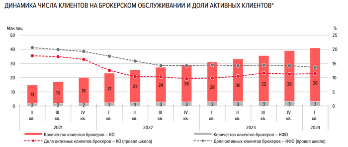 ▪️ Доля активных клиентов у брокеров - КО (кредитных организаций), через которых торгует основная часть розничных инвесторов, в 1 квартале выросла до 14,6%. Максимальный уровень за 2 года.