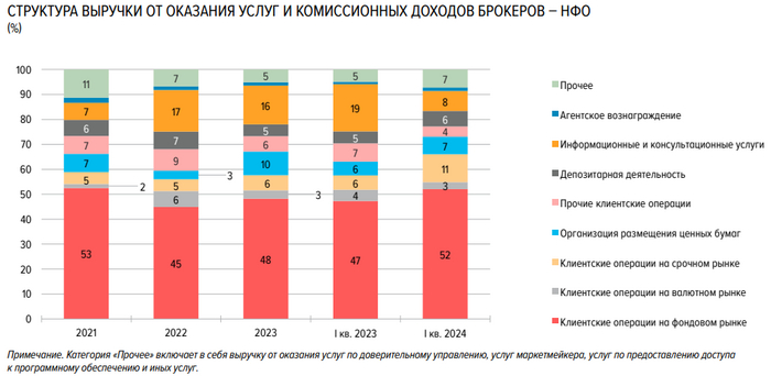 Собственно, главный ручеек, приносящий деньги в бурлящую реку брокерских доходов - это комиссионные доходы. На 1 квартал 2024 они составили 66% в общей массе выручки. При этом 52% пришли с фондового рынка, 11 со срочного.