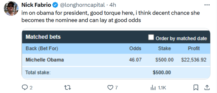 Вот некий юнит поставил 500 баксов на Мишель Обаму. Ежели срастётся, гражданин получит 22,5к $.