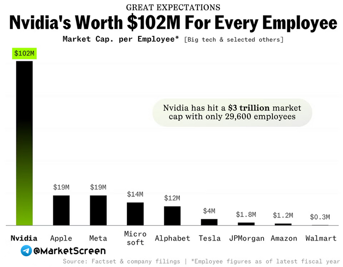 Существует множество способов оценить компанию: соотношение цены и прибыли, анализ дисконтированных денежных потоков или соотношение EV к EBITDA. Один действительно простой фундаментальный показатель заключается в следующем: насколько ценен каждый сотрудник, работающий в компании? Что касается Nvidia, то после того, как она превысила отметку в 3 трлн $, компания оценивается более чем в 100 миллионов долларов за каждого из своих 29 600 сотрудников (согласно данным на конец января 2024 года).
