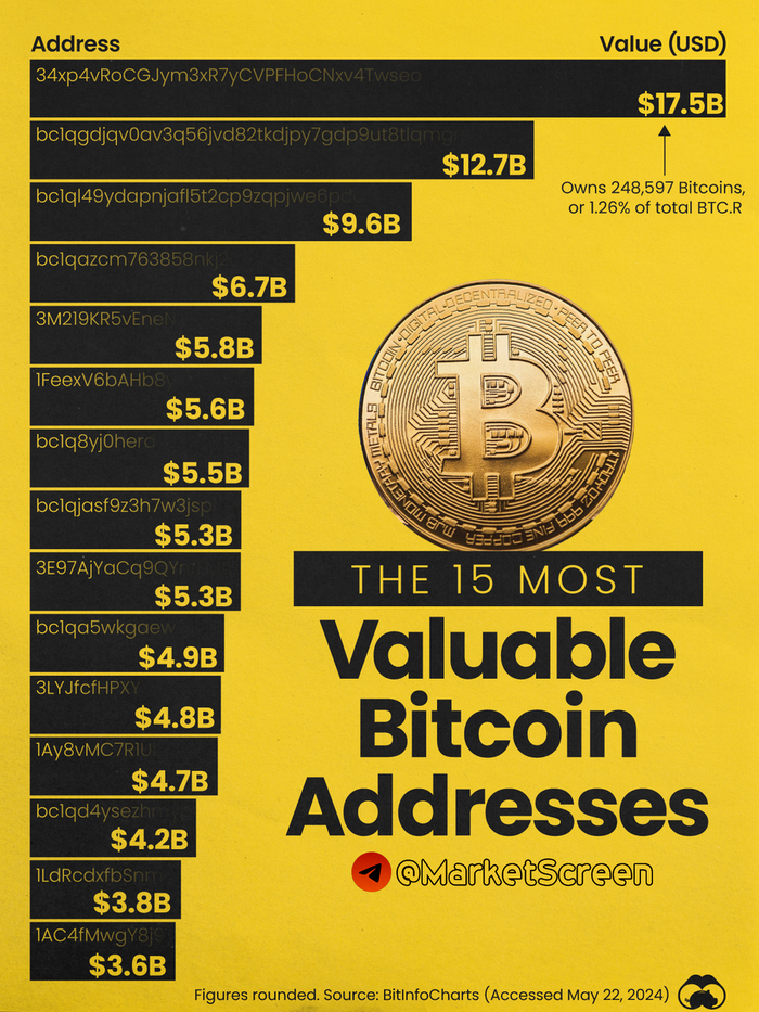 15 самых «богатых» биткоин-адресов в мире по состоянию на май 2024