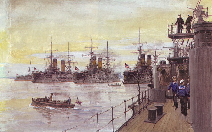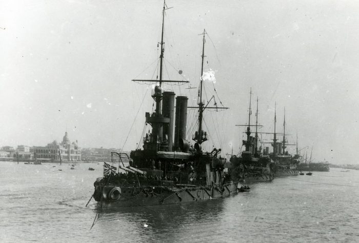 Корабли отряда Небогатова в Порт-Саиде. Головной – «Адмирал Ушаков». Часть конструкций боевого марса срезана, малокалиберные пушки с него убраны, вместо них установлены пулемёты.