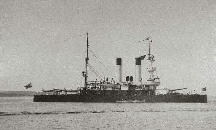 «Адмирал Ушаков» в учебном плавании. Хорошо видно вооружение броненосца: башенная установка 254-мм орудий; 120-мм орудие в каземате; выше него, на палубе спардека – пятиствольная 37-мм пушка, 63-мм пушка Барановского на морском станке и одноствольные 37-мм пушки на боевом марсе. В борту виден порт торпедного аппарата.