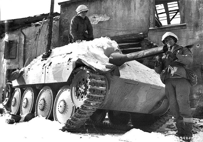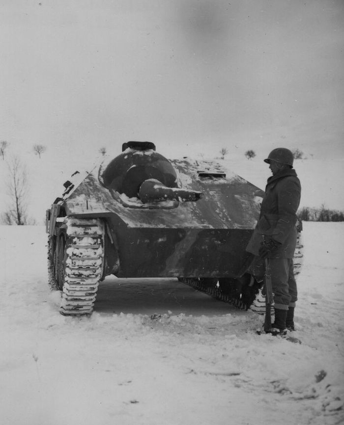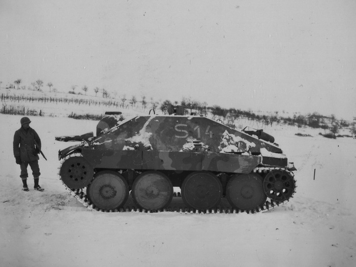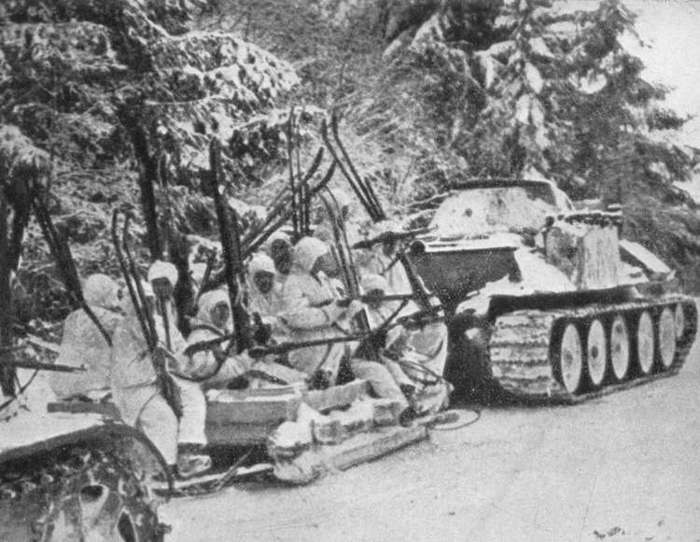 Финский солдат осматривает брошенный в сражении на Раатской дороге ОТ-26.