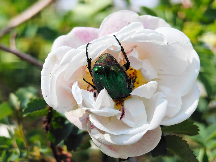 Во-первых, поляризация нужна для защиты от хищников. На крупных жуков-бронзовок покушаются многие птицы. Чтобы хоть как-то уменьшить это давление, они решили использовать физику. С точки зрения человека, жуки очень заметны на ярких светлых цветах. Но, по всей видимости, птицы плохо различают отражённый поляризованный свет. Пернатые принимают его за блики на солнышке. Так что насекомые спокойно выходят на кормёжку днём, абсолютно не опасаясь атаки хищников!