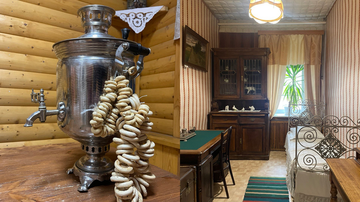 Слева - самовар, которому больше двухсот лет. А справа - комната горожанина 18-19 века. Два интересных факта расскажу. Стол и шкаф сделаны руками Ивана Малинина. Он отучился на краснодеревщика, но мечтал быть художником. Жизнь Ивана изменила поездка во Францию, где он провел 3 года и вернулся настоящим живописцем. Идею поездки ему посоветовал другой известный художник Илья Репин - Иван познакомился с ним во время своих частых визитов в Третьяковскую галерею.