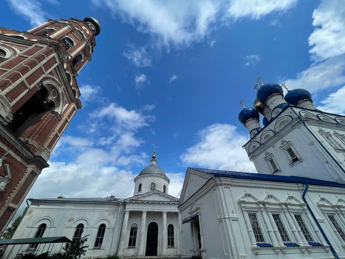 Собор (на фото справа) строился с 1696 по 1705, церковь (в центре) - в 1840-х. Последней возвели колокольню - в 1850-х. Интересно, что ее планировали сделать еще более высокой (сейчас - 73 метра), но тогда существовало негласное правило - ничего выше колокольни Ивана Великого в Кремле не строить.