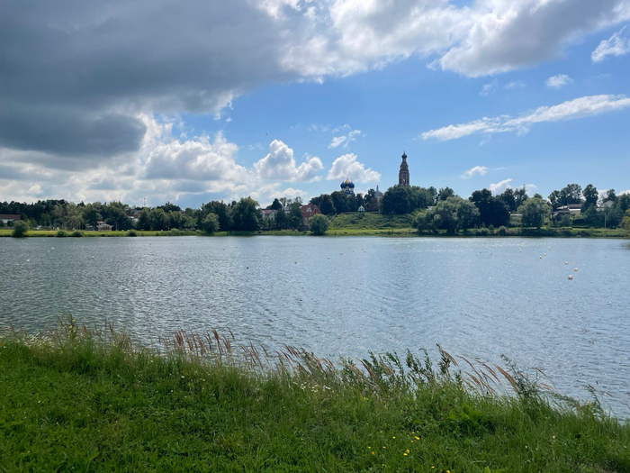 Гулять приятно, виды вокруг красивые. Дорожки все ведут к озеру Бельское, а за ним видны купола Соборной площади: