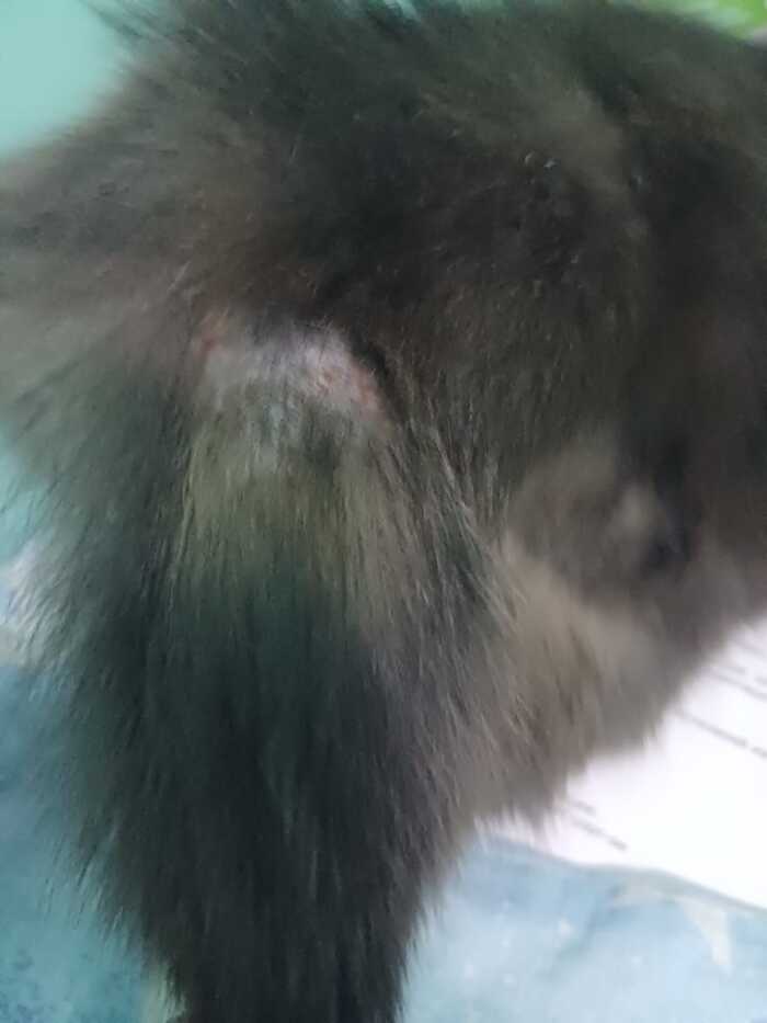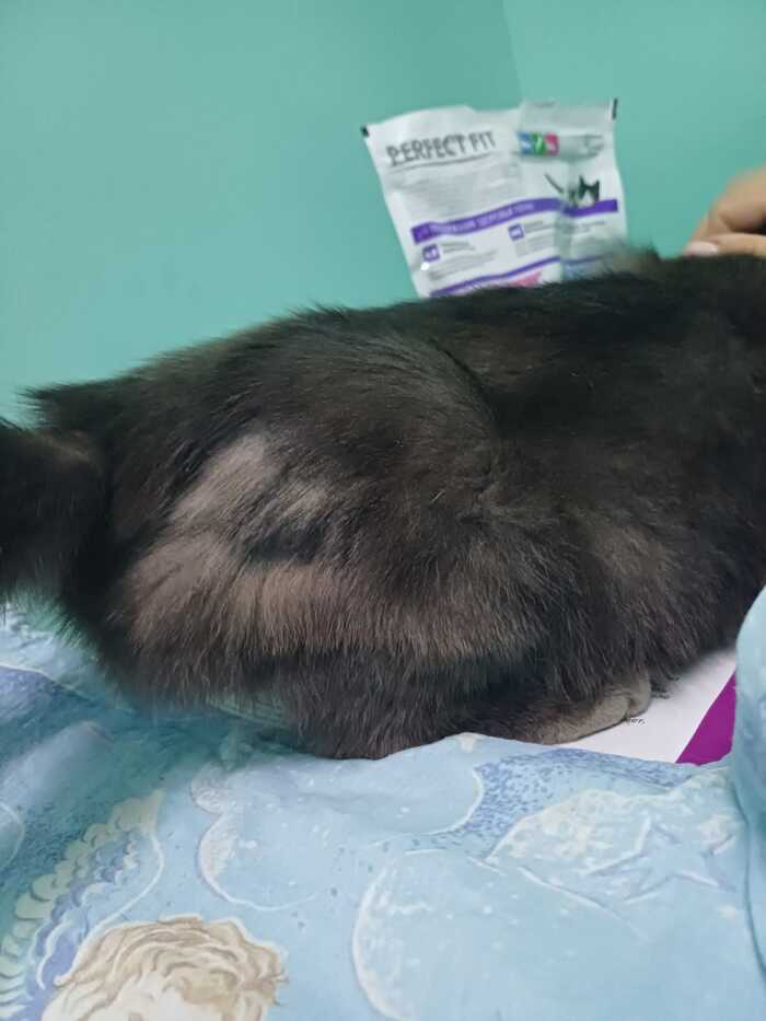 Кошка доставлена в клинику. Кроме обезвоживания и дефицита веса...у МАРУСИ - БЛОШИННЫЙ ДЕРМАТИТ . Шерсть выпала и вылазит клоками, кошка вся в расчесах. Кровь на анализ взять невозможно...