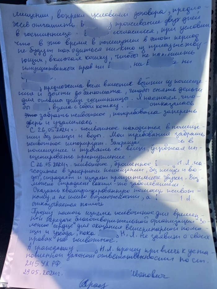 Итог: обращается к нам собственник. И вот заявление в полицию. И изьятие кошки.