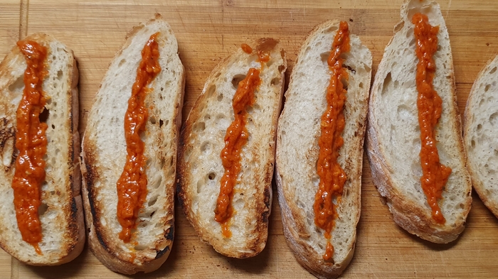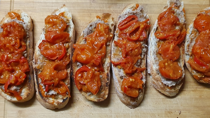 Значит, сушим чабатту, тушим томаты черри и болгарский перец или перец Рамиро с веточкой розмарина. Соль/перец/специи по вкусу. Я добавляю пару щепоток соли, чайную ложку свежемолотого перца (белый, чёрный, зелёный перец горошком) и сушёные лук и чеснок. Лучше, конечно, свежий чеснок, но не оказалось его под рукой.