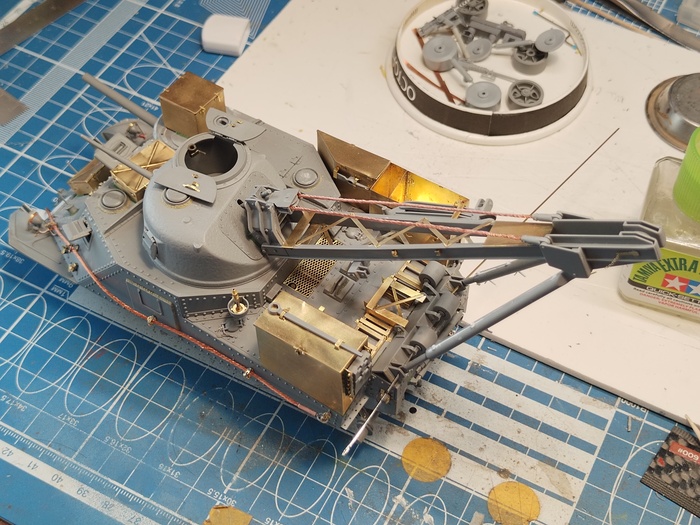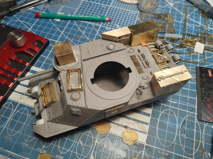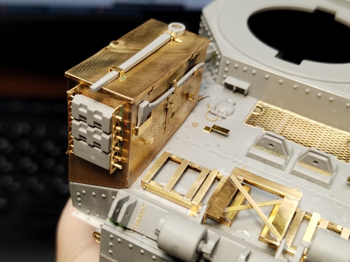 Провал случился в момент, когда я собрал ящики на лоб и корму. Они были мягко говоря ужасные. Крышка отлита с ящиком заедино и без каких-то намеков на защелки. Решил, что такая халтура меня не устроит, тем более, что моделька очень интересная и хочется, чтобы выглядела достойно. Начались поиска травла от Вояджер, так как альтернатив просто нет. Найти в России не смог, пришлось тащить с али, за баснословный ценник, почти как модель.