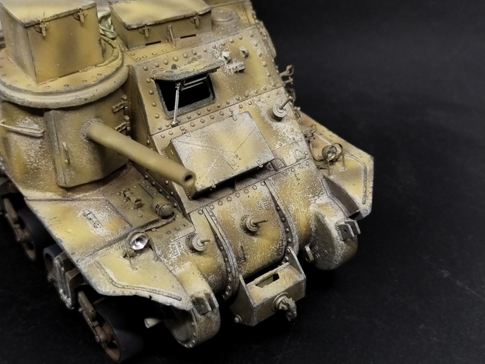 Загрязнения делал в несколько этапов. Сначала добавил засохшей пыли с помощью аэрографа цветом Buff, предварительно обработав модель жидкостью для сколов. Получил старый засохший и потертый слой пыли. Выглядит немного как облезший зимний камуфляж, но это подложка под основную пыль.