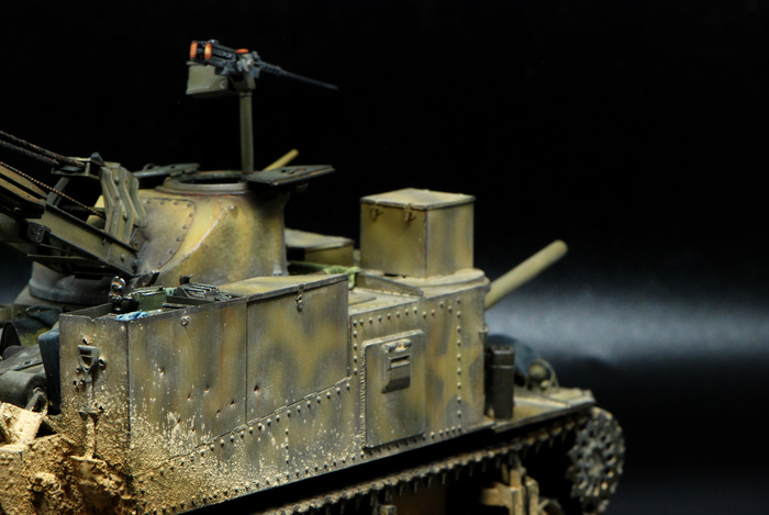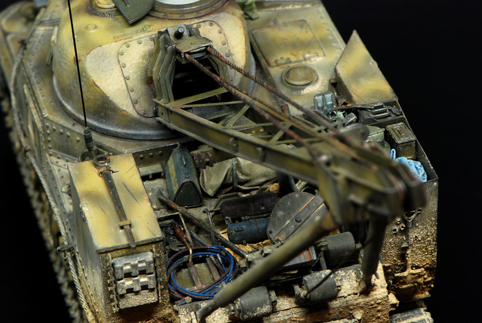 Дальше прошелся маслом и высветлил башню, а низ и углубления затемнил. Сделал сколы и смывку. Начал раскидывать базово окрашенный скарб. Подкинул подвеску покрасил мелочевку.