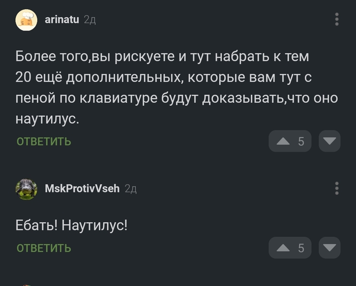 Надеюсь, вам было интересно, и вы узнали для себя что-то новое. Если вам придется отдыхать на берегах Тихого океана, постарайтесь не хватать руками ракушки в воде, потому что некоторые улитки могут даже пробить перчатку своим гарпуном, и тогда отпуск точно будет испорчен. Ну и, наверное, очень здорово, что они не вырастают до размеров в пару метров, иначе такая хтоничная дичь сожрала бы вообще всех.
