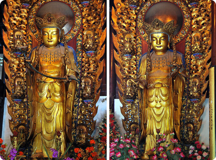 Во-первых, это цвет - большинство пекинских храмов окрашены в красный цвет, шанхайские же (все, что я видела) окрашены охрой.
